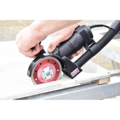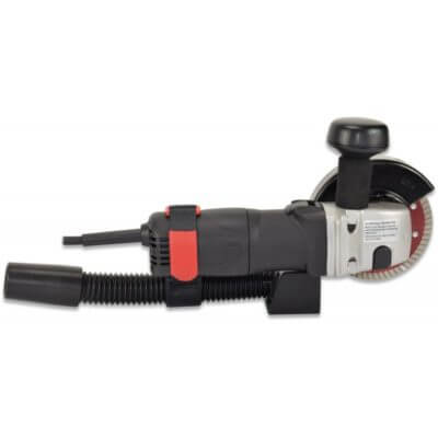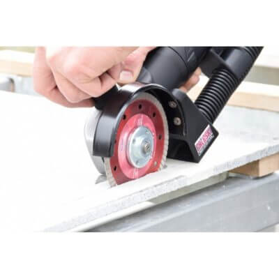 Compact single-hand dry cutter for a pulling cut, with extraction hood and connection to a vacuum cleaner.